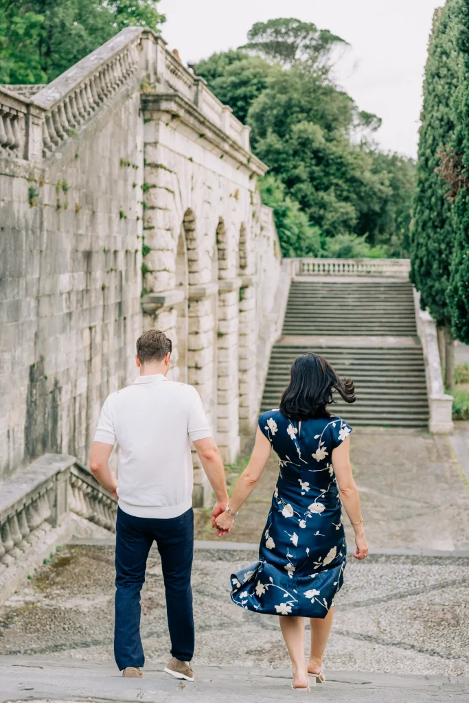 For an unforgettable evening photoshoot, Florence’s hillside viewpoints offer the most magical light. From the white marble terrace at San Miniato al Monte, you can enjoy one of the most striking panoramas of the city as it glows in the warm tones of sunset. A short walk down brings us to Piazzale Michelangelo — lively and often full of visitors, yet unmatched for its golden-hour view across the Arno and Florence’s iconic skyline. Nestled just below, the Rose Garden provides a quieter, more intimate atmosphere among greenery and sculptures, with the city softly illuminated in the background.